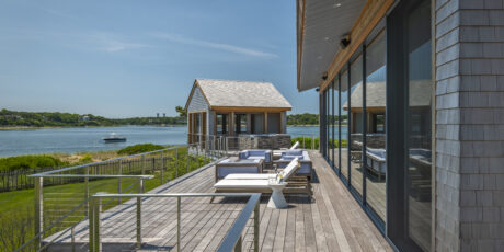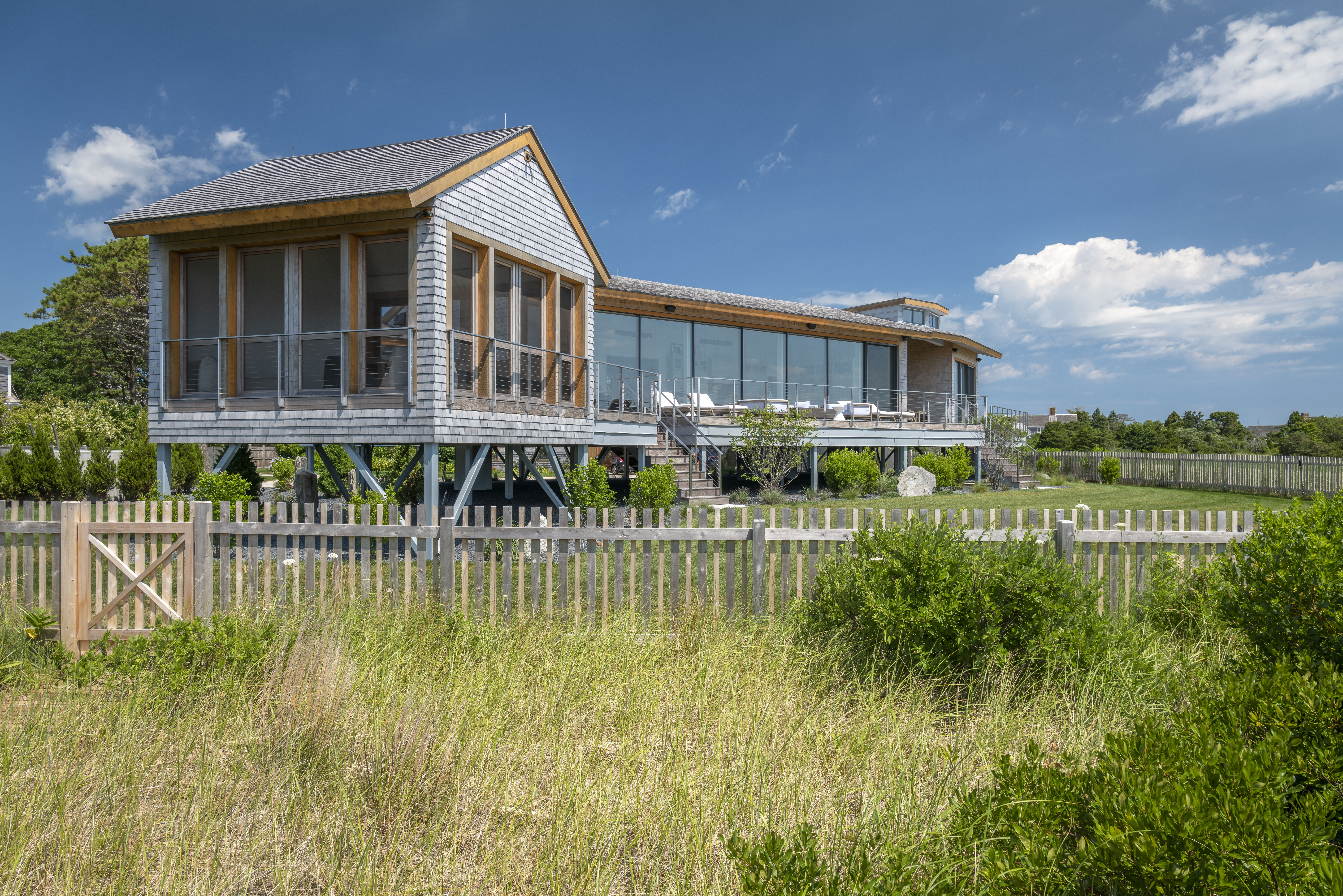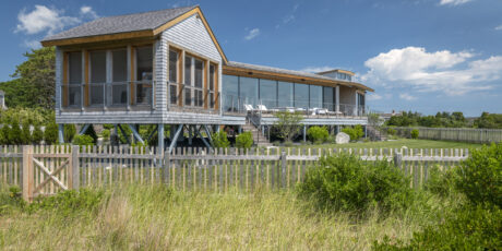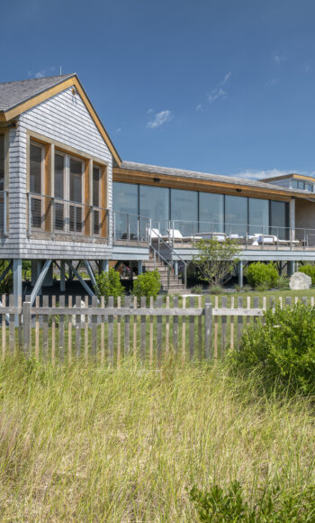 This beach house, built on a quiet cove on the Cape, sits on the site of a previous family home. The original house had suffered through a number of floods. After the last one, the family decided to build a new home, raised above the highest flood zone.