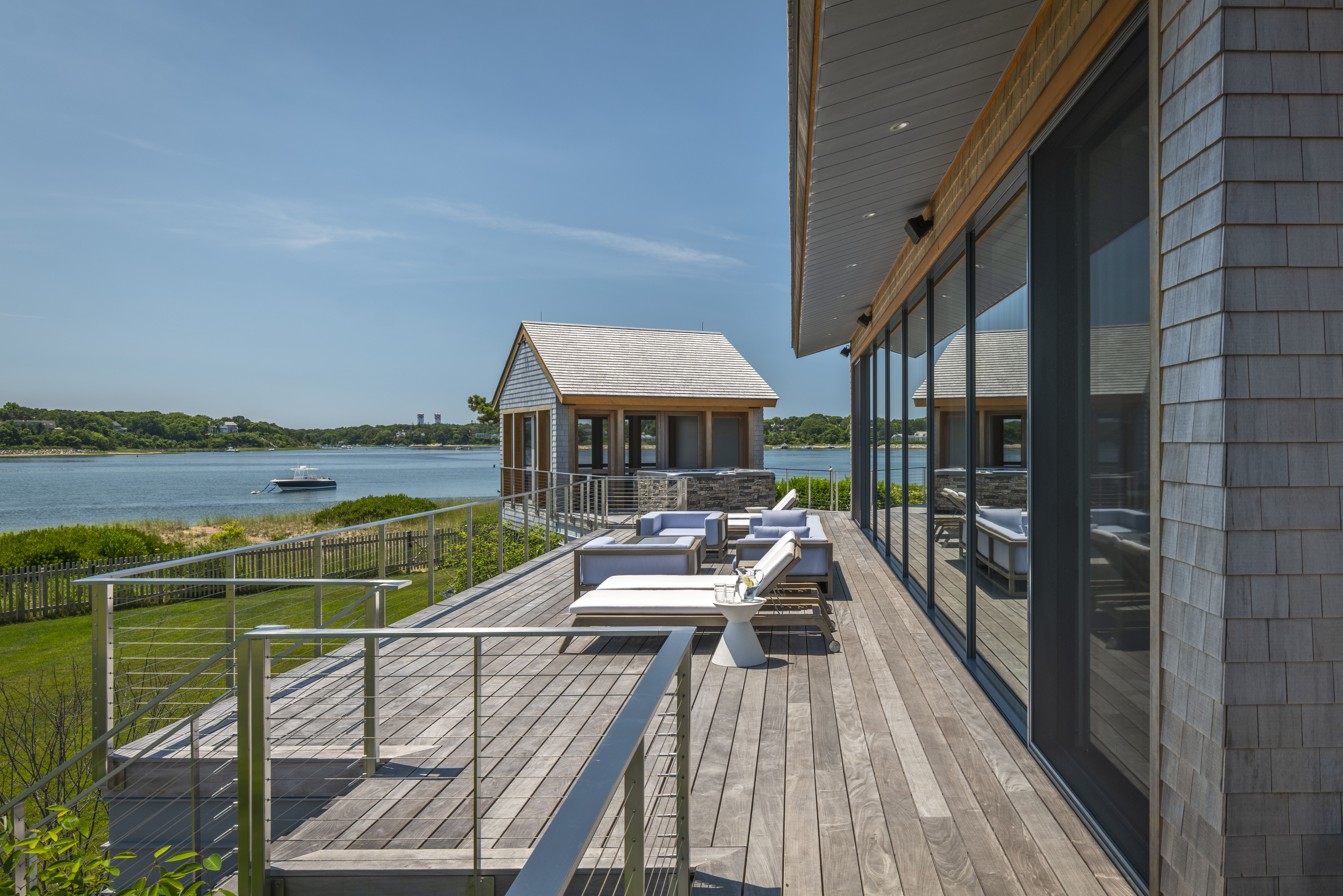 Aesthetically, traditional cedar shingles on the ocean facing side help the home blend into the neighborhood of similar cedar clad houses. Horizontal, standing seam zinc clad metal on the front of the house was carefully installed to present a modern feel akin to clapboard.”
